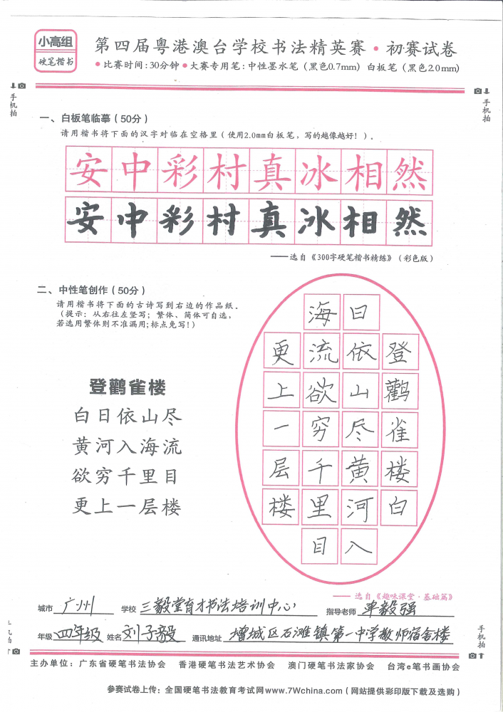 学校:增城区三毅堂育才书法中心(学校作品专页)