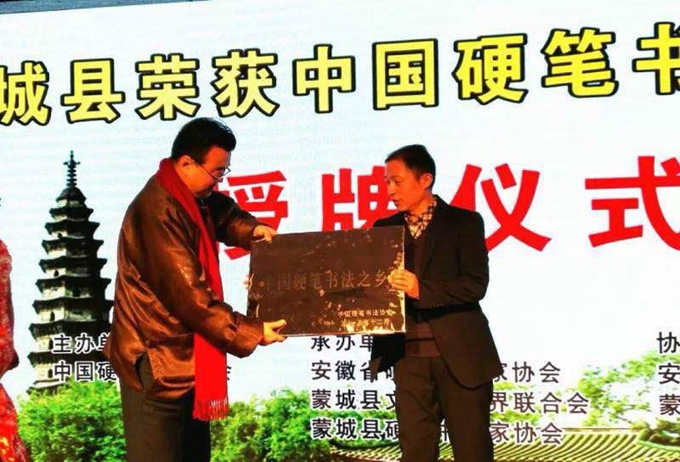 2015年12月30日上午,蒙城县荣获“中国硬笔书法之乡”授牌仪式暨“庄子杯”全国硬笔书法大赛颁奖仪式在庄子国际大酒店隆重举行。蒙城县人大常委会主任郭飚主持仪式。