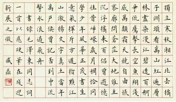 楷书的点画要分布有序,错落有致,不重叠交叉。如人之面目五官端正,眉目清楚。书写时注意笔画避让,避免出现笔画重叠和交叉的败笔。容易出现败笔的字如:给、米、拾等字。