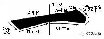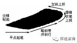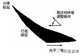 二、左尖横 1、起笔写点要水平左要尖。笔锋调好后沿水平方向由轻到重顺锋而下(手指执笔的轻重感要敏锐),略拉长形成左尖右圆的杏仁点。2、收笔仰势上抬。反弹转换笔锋提起后,提锋由下边沿向前向上延伸,再左上折与起笔下边保持平行,最后从上边收锋。3、笔画左低右高。与长横略斜带笔相同,带笔后保持斜向直接行笔(由于平点起笔笔锋指向已达到横的中锋运笔要求,故省略转笔调锋这一步而直接行笔),收笔后必然左低右高。