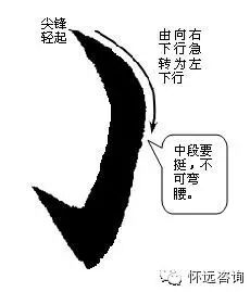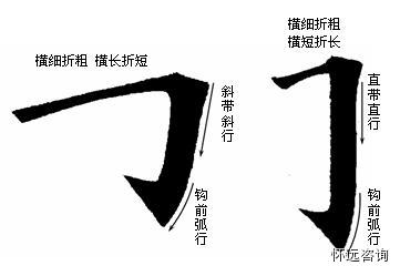 十、竖左弯钩 宁驼背勿弯腰。起笔右下行急转左下行,转弯处方圆并用,犹如驼背,但不弯腰,无伤大雅。如写成半圆形,犹如弯腰,则有疲软无力之感。