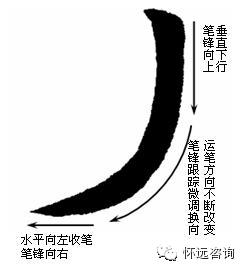 五、竖弯撇 1、转弯幅度大。由起笔的垂直向下到收笔的水平向左,靠腕的灵活转动控制笔锋转弯。2、锋向要跟踪。由于转弯幅度大,所以转弯时笔锋指向也要用手指顺时针捻动笔杆跟踪调节。否则写撇拐弯时笔画变粗而不协调。3、手腕转动和手指捻动要同步进行。
