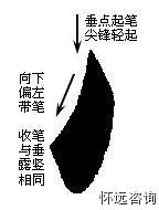 十四、左点 起笔用垂点法。即垂直下笔由轻到重写点,之后向下(略向左偏)带笔,收笔与垂露竖相同。如从背面横着看,它变成了左尖横,说明它与左尖横的书写规律是相通的。