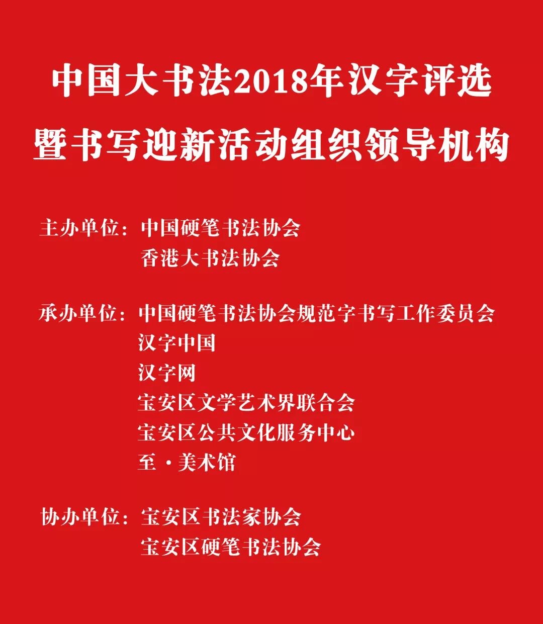 本次活动由中国硬笔书法协会、香港大书法协会联合主办,宝安区文学艺术界联合会、宝安区公共文化服务中心、至·美术馆等单位承办,宝安区书法家协会、宝安区硬笔书法协会协办。